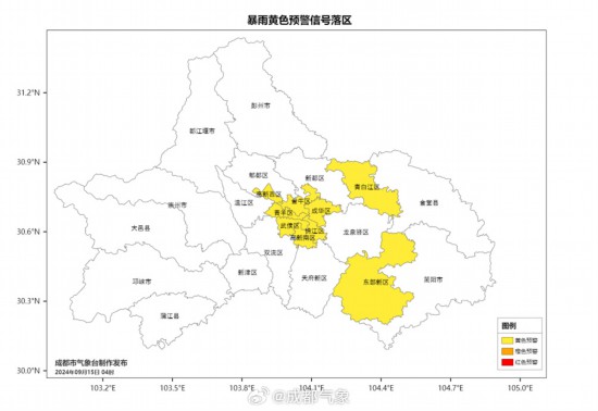 成都市氣象臺2024年09月15日04時10分發布暴雨黃色預警信號:預計未來6小時,成都市錦江區、青羊區、金牛區、武侯區、成華區、青白江區、高新西區、高新南區和東部新區的大部分鎮(街道)降雨量將達50毫米以上,降雨時伴有雷電和陣性大風。請注意防范暴雨、雷電和陣性大風帶來的不利影響。