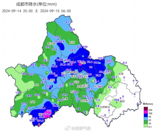 9月14日20時到15日6時成都市出現強對流天氣,全市共計出現25-50毫米136站,50-100毫米101站,100毫米以上14站。最大降雨量出現在蒲江鶴山石燕154.3毫米。其余降雨較大區(市)縣為:青白江城廂壁峰122.2、新都斑竹園121.9、郫都三道堰108.8、彭州濛陽三界100、都江堰石羊水月87.9、崇州道明烏尤84.3、溫江和盛77.3、龍泉驛洪安大同75.7、邛崍固驛同咀河75.7、金牛區天回鎮街道銀杏園社區71.9、高新區高新西園71.8、成華區龍潭立交59.8、天府新區新興孔雀51.3、金堂棲賢竹林45.5、大邑青霞45.4、雙流永安景山33.2、錦江區三圣鄉30.9、新津安西花碑26.9、青羊區草市萬福橋25.5毫米。一小時最強降水出現在蒲江壽安桐口68毫米。