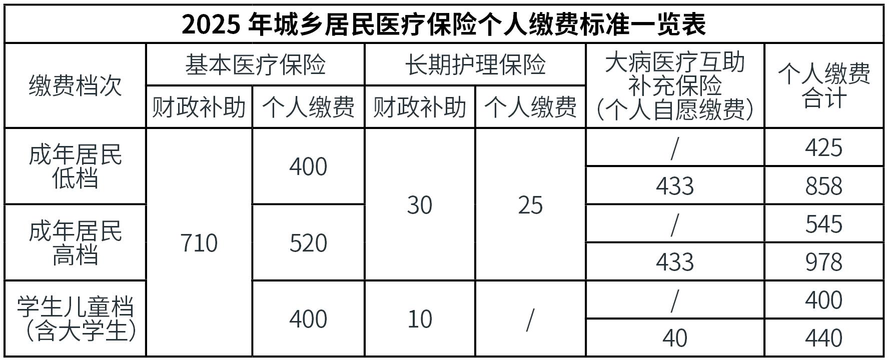 城鄉居民基本醫療保險:2025年度成都市城鄉居民基本醫保財政補助標準為每人710元,成年居民個人繳費標準分為每人400元和520元兩檔;學生兒童(含大學生)基本醫療保險個人繳費標準為每人400元。