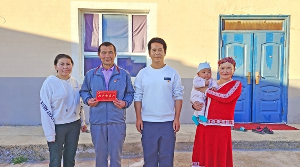 嚴?。ㄗ笕┤霊糇咴L并為共產黨員戶頒發銘牌。 (烏恰縣鐵列克鄉黨委供圖)