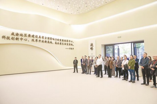“川渝高竹新區是全國首個跨省共建的省級新區,由廣安市、渝北區共同管理。新區緊靠重慶中心城區,屬‘重慶半小時通勤圈’,目前入駐企業201家,建成投產89戶?!钡谝徽?,與會嘉賓來到川渝高竹新區展覽館,跟隨講解員的腳步,全面了解新區發展歷程。