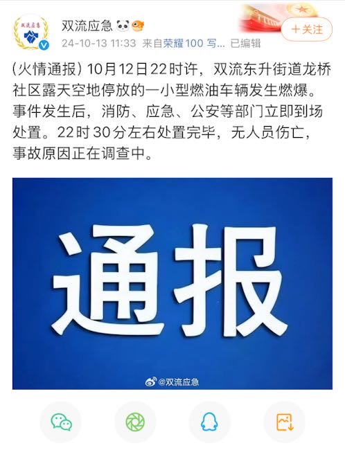 人民網成都10月13日電 (記者朱虹)據雙流區應急管理局消息,10月12日22時許,成都市雙流東升街道龍橋社區露天空地停放的一小型燃油車輛發生燃爆。事件發生后,消防、應急、公安等部門立即到場處置,并于當天22時30分左右處置完畢,無人員傷亡。事故原因正在調查中。 ???