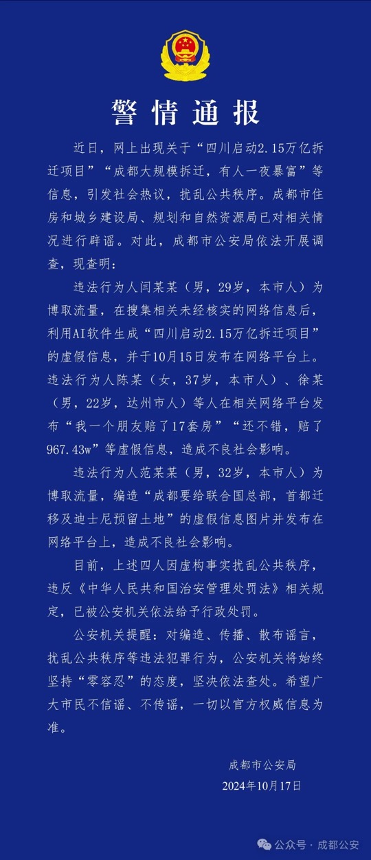 成都市公安局發布通報:網傳“四川啟動2.15萬億拆遷項目”屬虛假消息