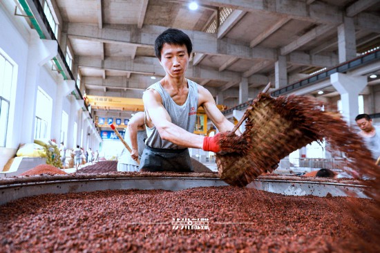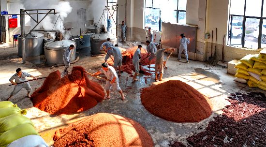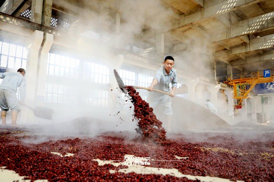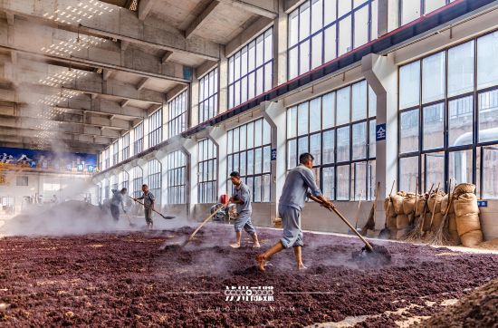 工人們正在攤晾蒸好的高粱。 白云訶 攝