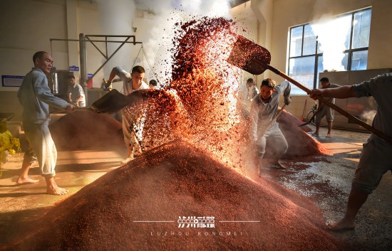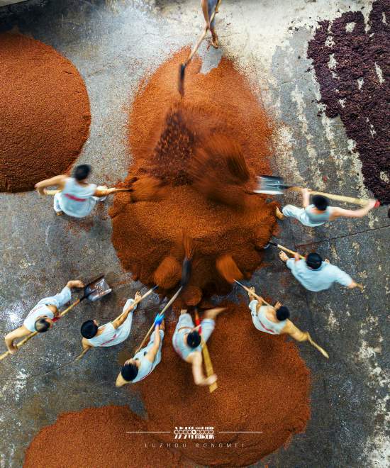 初冬時節,貢香酒業的釀酒車間,紅沙飛舞,空氣里彌漫著濃郁的酒香。車間內,一排排窖池正在安靜發酵。窖池旁,潤糧蒸糧、攤晾堆積、撒曲踢糟……工人們正有條不紊地工作。攝影師們紛紛拿出相機拍攝,此起彼伏的快門聲不絕于耳,將熱火朝天的釀酒場景一一定格。