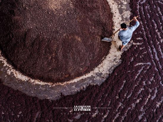 工人將攤晾撒曲后的高粱堆積發酵。向波 攝