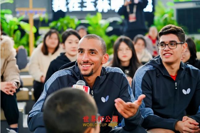 “請問你們是從什么時候開始打乒乓球的?除了乒乓球,你們還喜歡什么運動?”同學們的問題一個接一個地拋出,將現場的對話氛圍推至高潮?!拔覐男∈艿礁赣H的影響,9歲就開始練球了,現在能夠為我們國家隊效力,我感到非常榮幸!”奧瑪·阿薩爾針對同學們的提問,熱情地分享著自己的乒乓生涯。