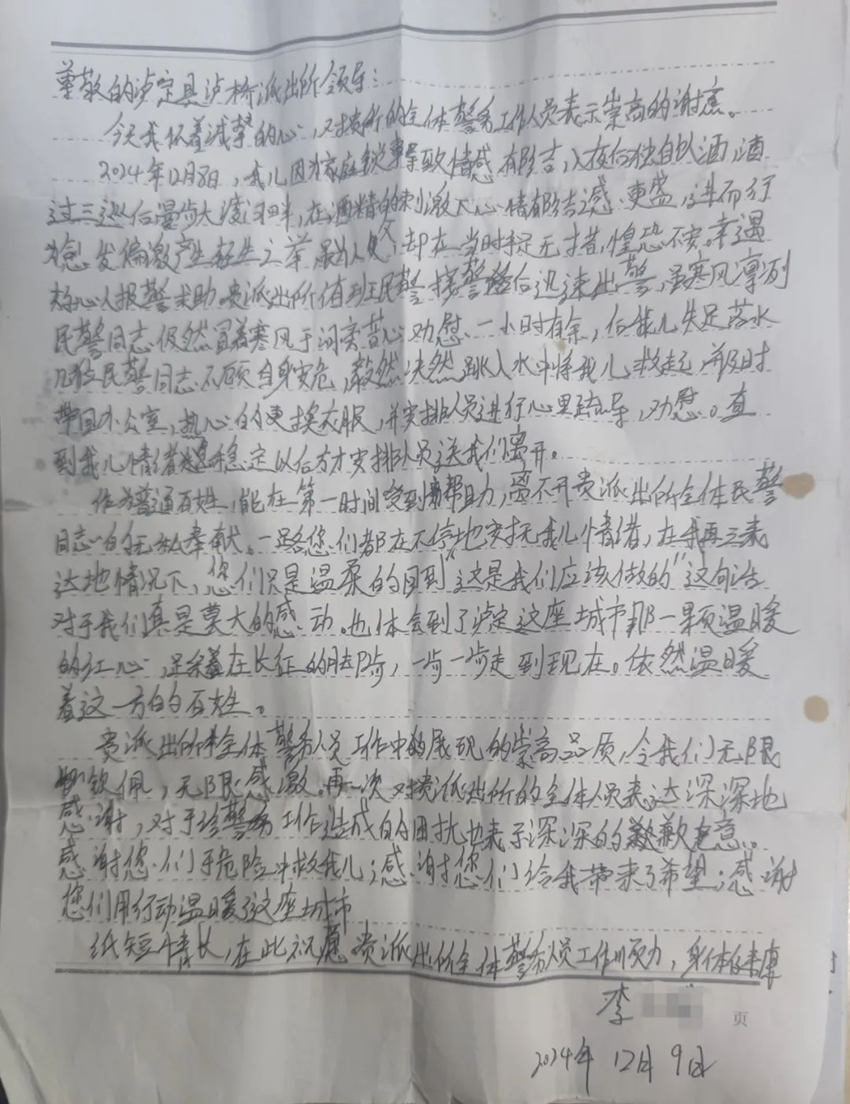 男子家屬送來的感謝信。瀘定公安供圖
