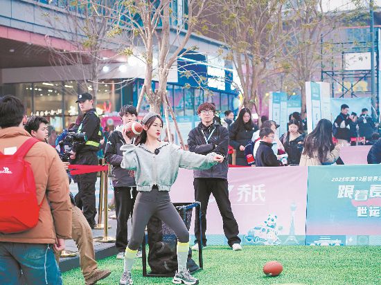 在現場,一系列精彩紛呈的世運體驗項目吸引了眾多市民駐足,射箭、飛盤、腰旗橄欖球等世運項目讓大家笑聲不斷。特別是“世運沖沖沖”項目前更是排起了長隊,跑酷、推箱子、攀巖、力量舉……“去年,我在環球中心便體驗到世運會比賽項目的樂趣?!笔忻駨埾壬鷰е胰思尤搿笆肋\沖沖沖”的挑戰當中,“太好玩了,挑戰充滿樂趣,還讓我們對世運會有了更多的了解?!保ǔ啥既請箦\觀新聞記者 黃一可 主辦方供圖)
