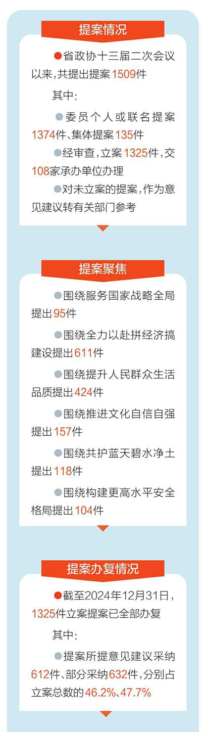 值得一提的是,2024年,省政協還探索開展“定向提案”征集工作。聚焦省委發展新質生產力等重要決策部署,省政協定向邀請31名科技、經濟等界別委員,共計提交提案58件。