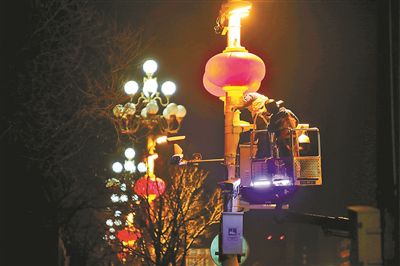 國網北京電力城市照明管理中心工作人員正在長安街安裝大紅燈籠 攝影/張超