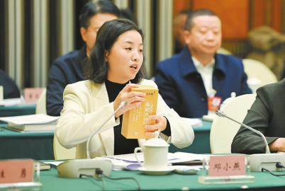 鄧小燕代表拿出家鄉的“東寶貢”有機大米,圍繞打造新時代更高水平“天府糧倉”、確保糧油安全進行發言。
