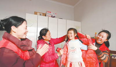 安徽省金寨縣燕子河鎮張畈村,志愿者在困難群眾家里幫助孩子試穿新衣服。
