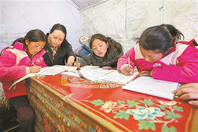 西藏自治區日喀則市薩迦縣普村的安置點內,黨員次央(左二)在輔導村里的小朋友寫作業。