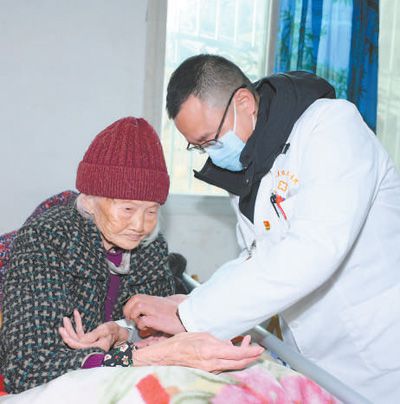 四川省眉山市丹棱縣仁美鎮雄義村,村醫徐遠利(右)為92歲的張玉珍測量血壓。