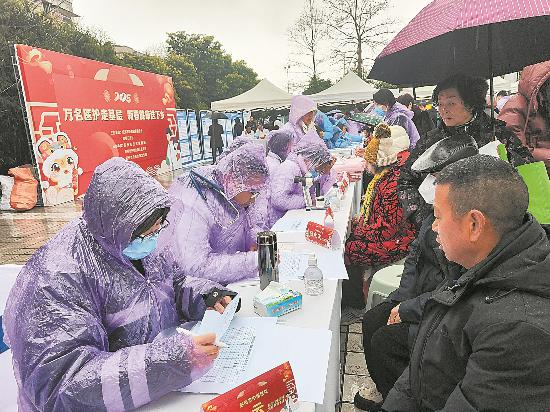 2月7日上午9點,義診尚未開始,家住彭州市丹景山鎮的趙爺爺冒雨來到了現場,“醫生我前幾天摔了一跤,傷好了,但膝蓋一直痛,你快幫我看看?!碑斕?,由成都市衛健委和成都日報社共同主辦的2025“萬名醫護走基層 新春健康送下鄉”活動第二場在彭州市丹景山鎮舉行?,F場,來自成都市第三人民醫院、成都市第四人民醫院、成都市第五人民醫院、成都市第六人民醫院、彭州市人民醫院、彭州市中醫醫院、彭州市婦幼保健院、彭州市公共衛生救治中心、彭州市疾控中心、彭州市丹景山鎮衛生院的40余名專家為當地居民提供看病義診、健康咨詢等服務。