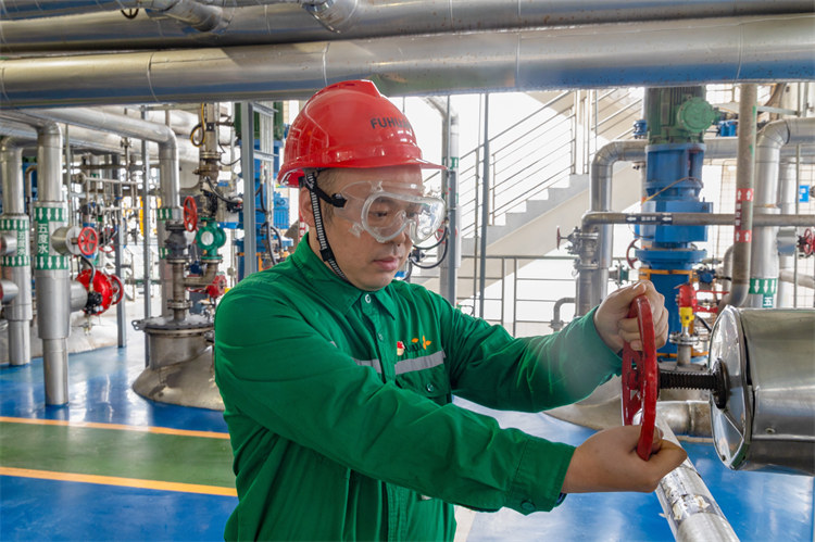 在福華化學農化循環產業園內,吳倫飛身著綠色工裝,穿梭在生產現場,仔細巡查每一處細節,并不時與員工交流,確保生產流程萬無一失。