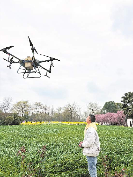 一年之計在于春。3月進入春耕期,廣袤的天府良田又忙碌起來。在崇州市大劃鎮崇鎮社區2組麥田田埂邊,一陣“微型龍卷風”后,一架載有30升農藥的無人機騰空而起,飛向大片剛剛吐露新綠的麥田并有條不紊地噴灑農藥……