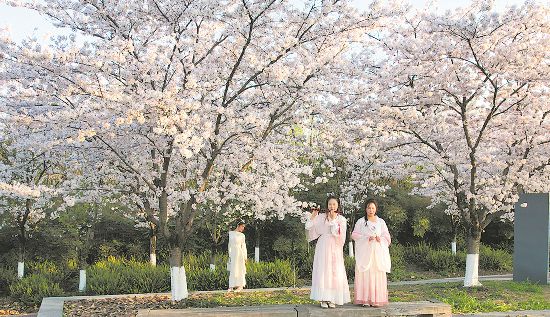 公園內長達2公里的櫻花步道被白色花海覆蓋,微風拂過時落櫻紛飛,場景如夢似幻。不少游客身著漢服或淺色衣裙,借助櫻花背景拍出氛圍感十足的照片。