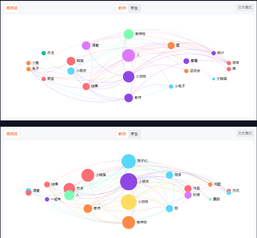 在課堂內在邏輯結構(高頻詞)分析中,系統通過分析教師和學生的課堂高頻詞匯,當兩個高頻詞匯出現在同一句話中時生成連線,以此直觀展現教師課堂重點之間的聯系是否緊密、邏輯是否清晰。