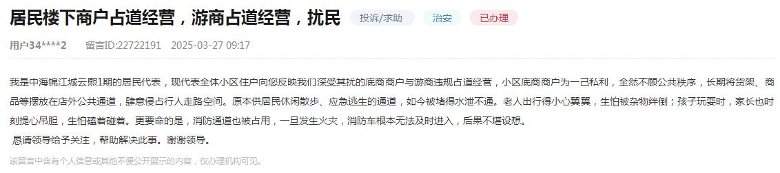 “小區底商長期將貨架、商品等擺放在店外公共通道,肆意侵占行人走路空間。原本供居民休閑散步、應急逃生的通道,如今被堵得水泄不通?!苯?,成都網友通過人民網“領導留言板”反映小區外商戶擾民問題。