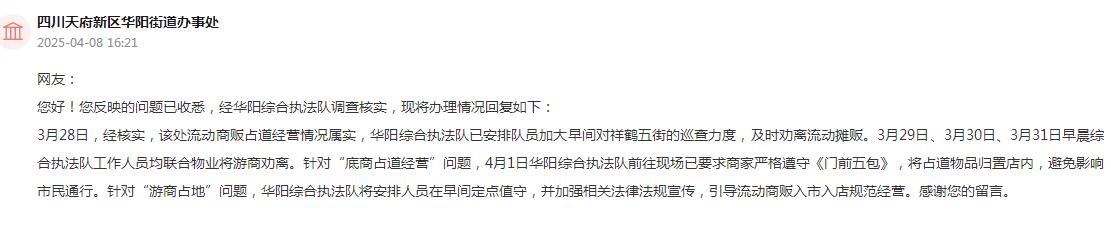 經成都市華陽綜合執法隊調查核實,網友反映的流動商販占道經營情況屬實,華陽綜合執法隊已安排隊員加大早間對祥鶴五街的巡查力度,及時勸離流動攤販。3月29日、3月30日、3月31日早晨,綜合執法隊工作人員均聯合物業將游商勸離。