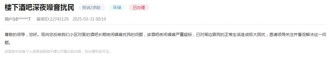 日前,瀘州一網友留言反映小區對面的酒吧長期夜間噪音擾民問題,網友表示,“該酒吧夜間噪音嚴重超標,已對周邊居民的正常生活造成極大困擾”。