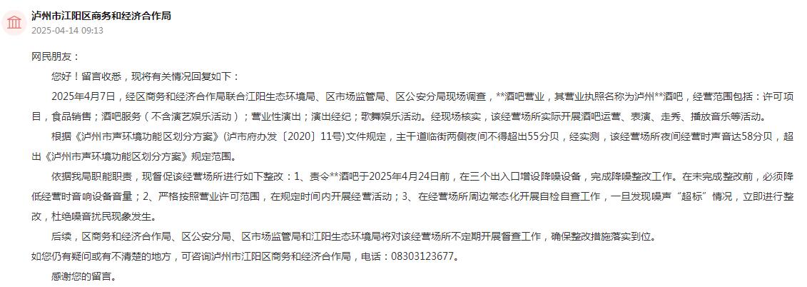 2025年4月7日,瀘州市江陽區商務和經濟合作局聯合江陽生態環境局、區市場監管局、區公安分局進行了現場調查。該經營場所夜間經營時聲音達58分貝,超出《瀘州市聲環境功能區劃分方案》規定范圍。
