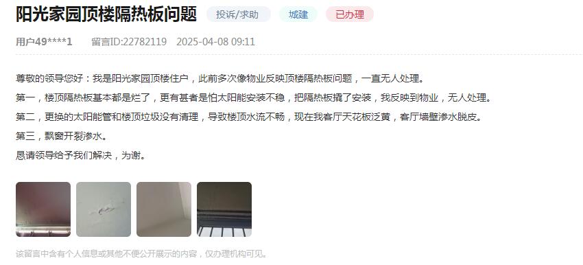 為解決網友反映的問題,社區將開展以下工作:一是立即安排物業對樓棟隔熱板破損嚴重的單元住戶進行排查登記,按照輕重緩急及破損程度進行逐步維修整治;二是立即對樓頂堵塞排水孔、亂堆亂放等問題件進行清理整治,對樓頂種菜、養花進行巡查勸導,嚴防堵塞排水孔、損壞隔熱板情況再次發生;三是對其飄窗漏水問題,社區盡快協調小區工程部專業人員,幫助其提供必要的解決方案。