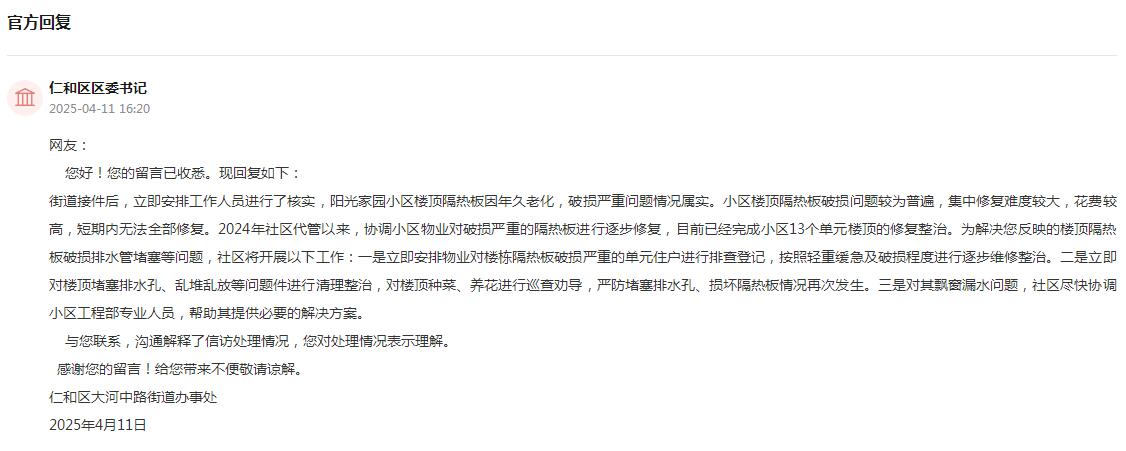 收到留言后,攀枝花仁和區相關部門立即安排工作人員進行了核實。經查,網友所在小區樓頂隔熱板破損問題較為普遍,集中修復難度較大,花費較高,短期內無法全部修復。2024年社區代管以來,協調小區物業對破損嚴重的隔熱板進行逐步修復,目前已經完成小區13個單元樓頂的修復整治。