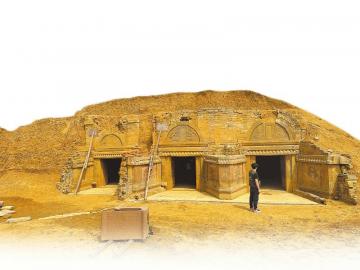 記者在現場看到,該蜀王陵是一處夫妻合葬墓。中間為蜀王陵寢,左右分別為其兩位妃子的墓葬,三座墓葬在同一封土堆下。這些封土經過夯筑,現存直徑約60米、高約5米。三座墓葬均為磚石結構,大小相近,結構也基本相同。