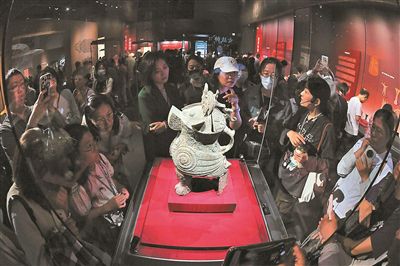 值得注意的是,展覽還有一些限時“出差”的展品,其中占據展廳“C位”的就是殷墟出土的珍貴文物——亞長牛尊。據悉,牛尊的展陳時間僅一周,為5月19日至5月25日。之后的5月27日至6月5日展陳文物為青銅手,6月17日至7月13日展陳文物為銅象尊,7月21日至8月24日展陳文物為孤品雙面銅人像。展柜在這些限時展陳的文物之外,將由首博的備用文物接替“上崗”,想要參觀特定展品的觀眾請注意展陳時間,以免跑空。