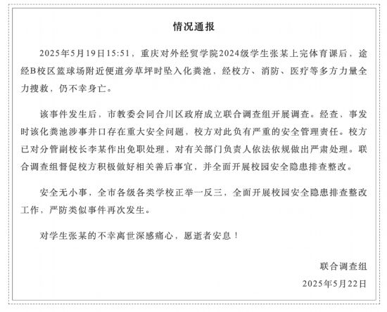 通報稱,2025年5月19日15時51分,重慶對外經貿學院2024級學生張某上完體育課后,途經B校區籃球場附近便道旁草坪時墜入化糞池,經校方、消防、醫療等多方力量全力搜救,仍不幸身亡。