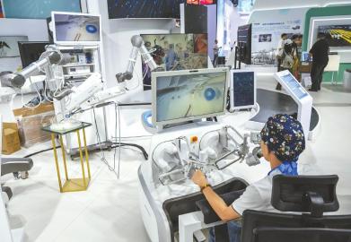 工作人員在展示加入人工智能的腹腔鏡手術機器人。