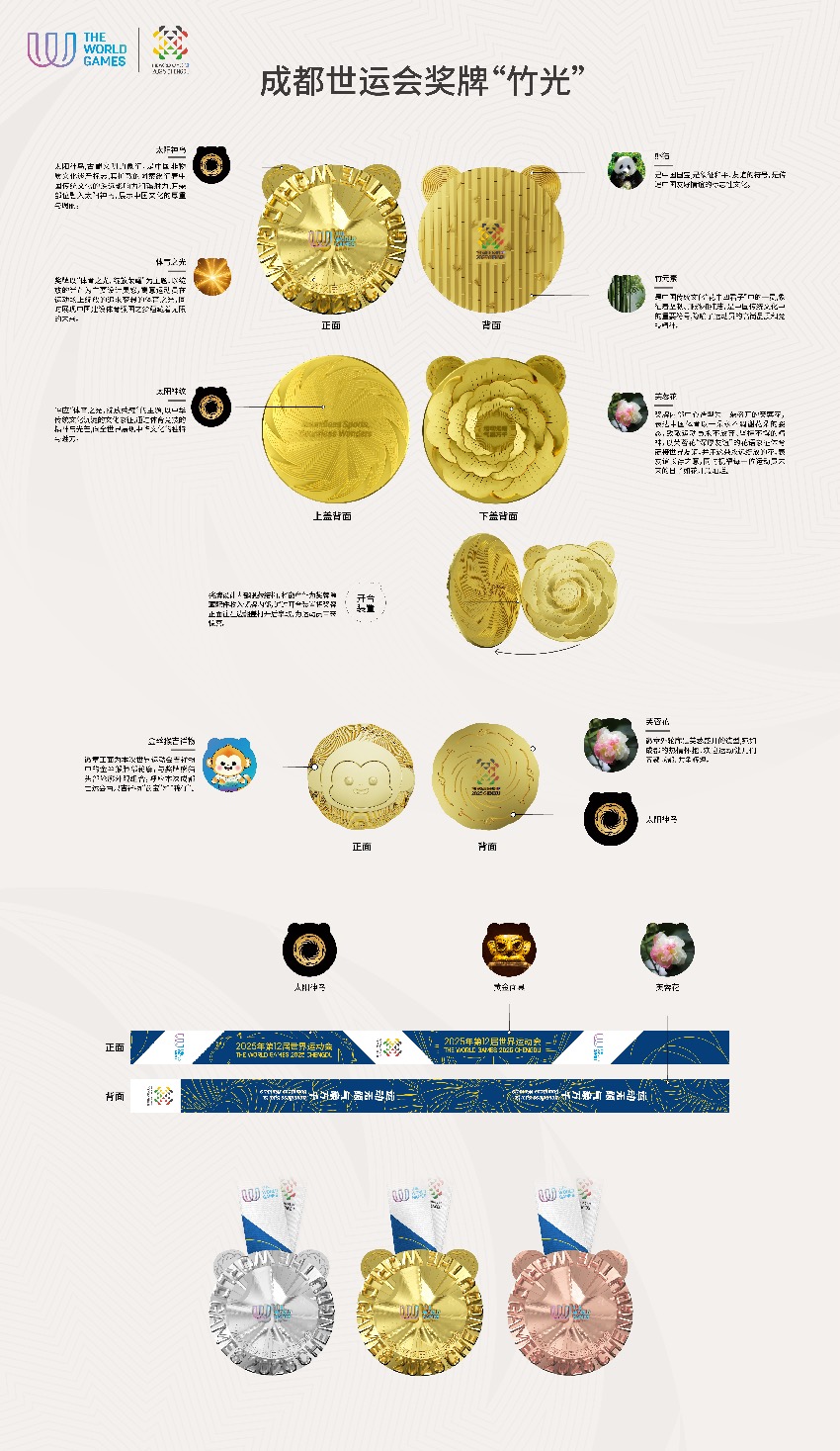 “竹光”獎牌的設計,深深植根于中國文化底蘊與成都獨特魅力。獎牌正面,國際世運協會徽居中醒目,賽事中英文名稱環繞呼應。巧妙融入的太陽神鳥紋飾,與暗合城市輪廓的流動凹凸線條,在底部營造出層層光芒,既彰顯中華文明、巴蜀文化的璀璨歷史,更象征著運動精神永恒閃耀。