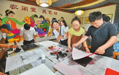④6月23日,采訪組成員在德陽綿竹市年畫村體驗拓印年畫。