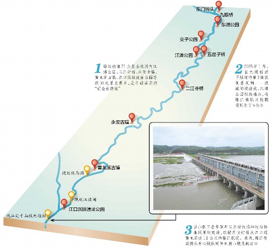 記者了解到,錦江上游正在分期分段推進航道建設。今年1月,自九眼橋而下規劃的第3座低壩景觀閘——繞城閘壩建成,江灘公園航線推出,將錦江通航里程朝南延長了5公里。