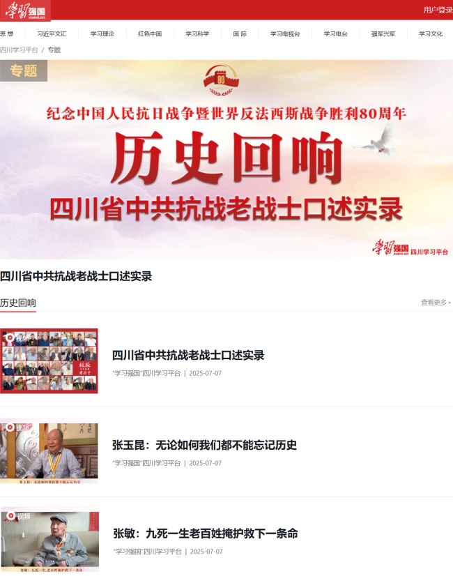近年來,四川省委黨史研究室會同有關部門聯合開展了“四川省中共抗日戰爭口述史采集整理研究工程”,拍攝制作了30集“四川省中共抗戰老戰士口述實錄”系列微視頻,于紀念中國人民抗日戰爭暨世界反法西斯戰爭勝利80周年之際,在“學習強國”四川學習平臺、“四川觀察”APP、四川新聞網、“四川黨史”視頻號等平臺同步上線展播。