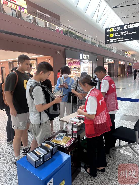 7月21日,記者來到天府機場實地探訪,發現離安檢口大概兩米遠的位置,新設置了充電寶核驗處,充電寶們在這里進行“安檢”?,F場廣播提示:請攜帶充電寶的乘客到充電寶核驗處檢驗,檢驗不合格的可以選擇丟棄,也可以選擇到后方十米處的京東充電寶寄件處進行寄件。