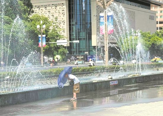 下午3時許,天府廣場的噴泉區域,水流隨著噴頭的旋轉變換著花樣,惹來一眾行人和旅客駐足欣賞?!皨寢?,快看!水噴到我臉上了!”兩個小孩舉著遮陽傘遮擋水霧,隨后他們像是發現了更好玩的事情,靠近噴泉圍欄,掬水拍臉。一旁的家長不僅沒有制止,反而舉起手機記錄這“歡樂時刻”。