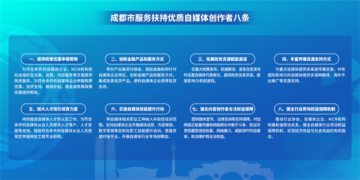 活動現場,成都也推出了重磅支持措施——《成都市服務扶持優質自媒體創作者八條》,從提供政策優惠申報幫助、創新金融產品、拓展政務資源、加大人才招引、強化合法權益保障等八個方面,為自媒體創作者提供全方位服務保障。