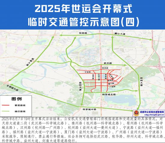 四、2025年8月7日19時至開幕式活動結束,公安機關交通管理部門將根據道路和交通流量的具體情況,對天府大道南二段(武漢路—科學城北路)、雅州路(杭州路—科學城北路)、蜀州路(杭州路—科學城北路)、漢州路(杭州路—廣州路)、杭州路(益州大道—夔州大道)、寧波路(益州大道—福州路)、福州路(益州大道—寧波路)、廈門路(益州大道—寧波路)、廣州路(益州大道—寧波路)采取疏導、限制通行、禁止通行等措施。社會車輛可選擇經武漢路、牧華路、梓州大道、科學城北路、科學城中路、益州大道、劍南大道等道路繞行。