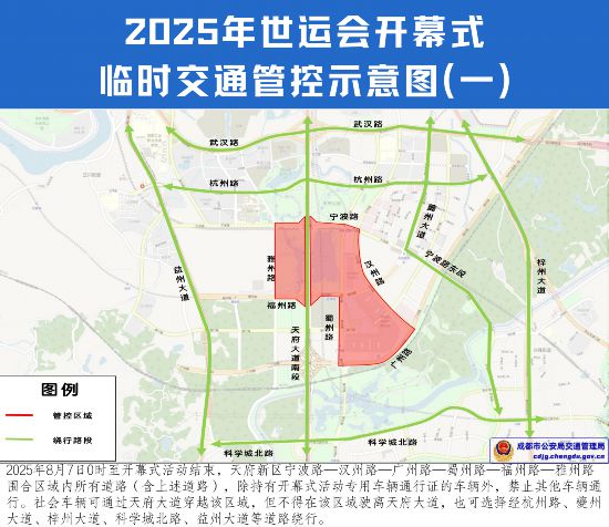 二、2025年8月7日10時至開幕式活動結束,天府新區杭州路—夔州大道—寧波路—廣州路—益州大道—寧波路—嘉州路圍合區域內所有道路(不含上述道路,廣州路東段除外),除持有開幕式活動專用車輛通行證及該圍合區域內居民、單位車輛外,禁止其他車輛通行。社會車輛可通過天府大道穿越該區域,但不得在該區域駛離天府大道,也可選擇經杭州路、武漢路、夔州大道、梓州大道、科學城北路、益州大道等道路繞行。