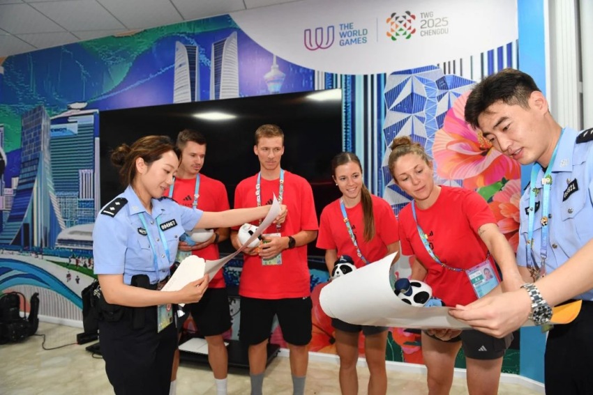 此刻,沒有語言的阻礙,只有守護者之間的共鳴。為了表達對成都公安提供賽事安全保障的感謝,Anna和隊友們拿出3張滿載簽名的世運會主題海報,鄭重地交付給龔千淋。龔千淋與同事則捧出憨態可掬的“熊貓警察”玩偶回贈。