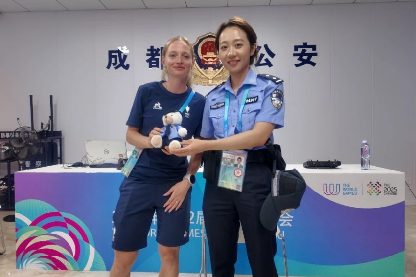 德國運動員剛離開,法國運動員又帶著好奇踏入警務站。當得知其中的Lefeuvre也是警察時,龔千淋微笑著將另一只警察小熊遞上,并預祝她們賽場凱旋。