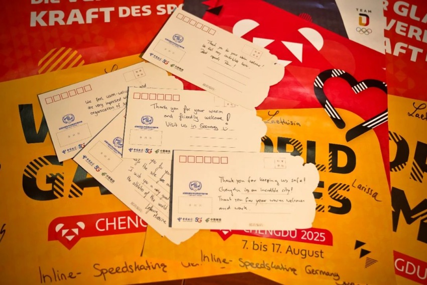 Anna、Lefeuvre和她們的隊友們在警務站的明信片上留言。成都高新公安供圖