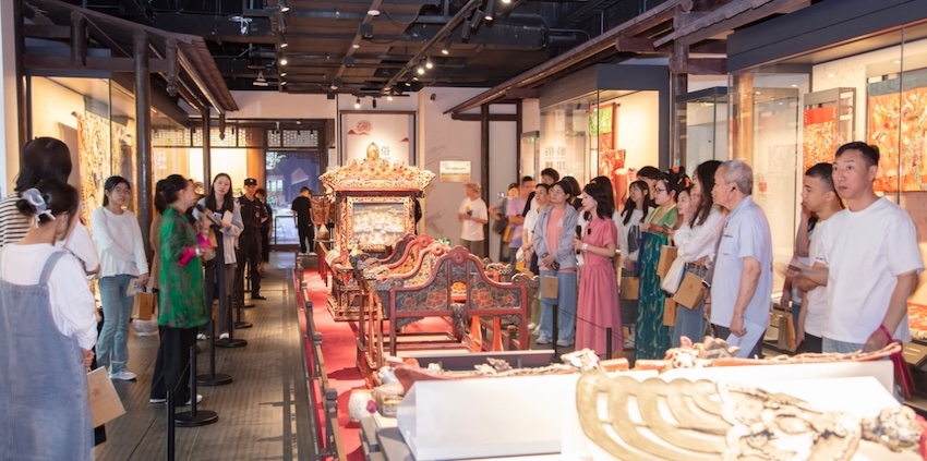 以館藏婚俗文物導覽為載體,四川大學博物館還在不斷地開展主題系列策劃活動。眼波流轉、水袖翻飛,今年端午節期間,一場名為“千年敢愛”的系列民俗研學活動在四川大學博物館舉行。伴隨川劇國家一級演員馬麗婉轉的高腔,觀眾眼前呈現的是川西傳統婚俗場景:高懸的燈籠、開路的儀仗、迎新的花轎,新人的鳳冠霞帔、鞋履玉帶、珠串蓋頭,盡顯嫁娶之禮的厚重綿長。