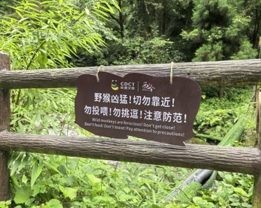 記者注意到,景區內確實設有告示牌,寫有“野猴兇猛!切勿靠近!”“認識藏酋猴,遠離藏酋猴”等內容。此外,景區門口有喇叭循環播放“請大家不要挑逗、遠離猴群”。