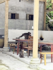 同樣受“猴患”困擾的,還有當地經營酒店的付女士?!澳憧纯催@里都毀成什么樣了?”她指著酒店旁一處露天飯廳說道。這片緊靠山腳的區域,是猴子下山的“第一站”,飯廳里的罐子、碗、天窗玻璃早已被猴群破壞得七零八落,桌椅更是東倒西歪,一片殘破。采訪間,不時有幾只猴子在懸梁上飛檐走壁,還順著電線跳到酒店屋頂嬉戲打鬧。