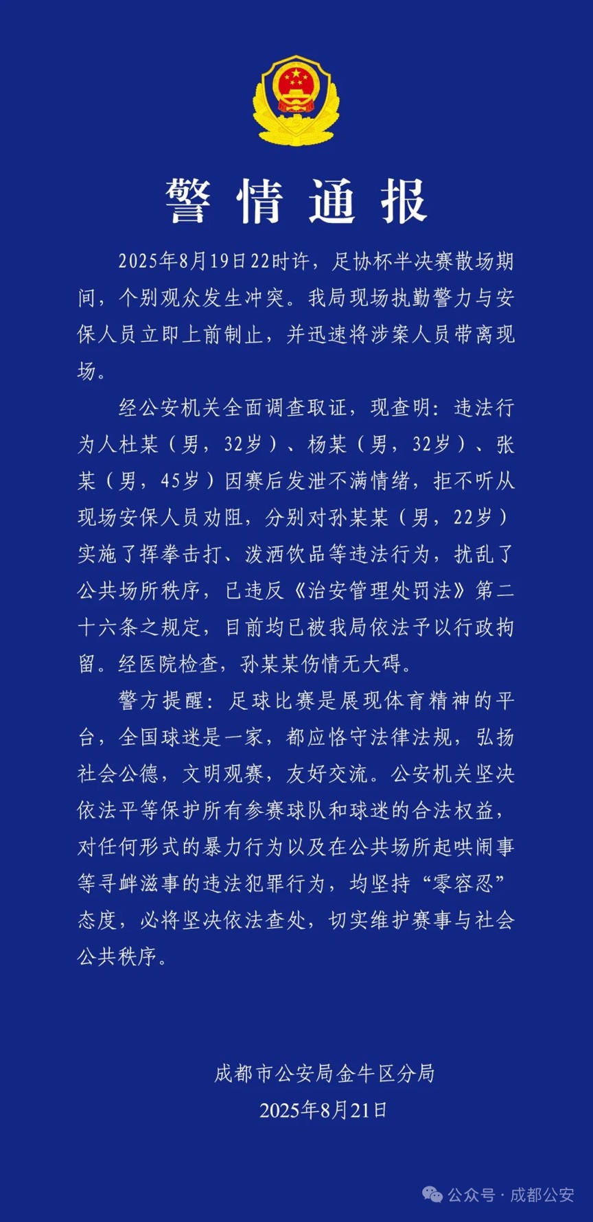 人民網成都8月21日電 (記者李平)8月21日,成都市公安局金牛區分局發布警情通報,對于賽后滋事的3人給予行拘的處罰。